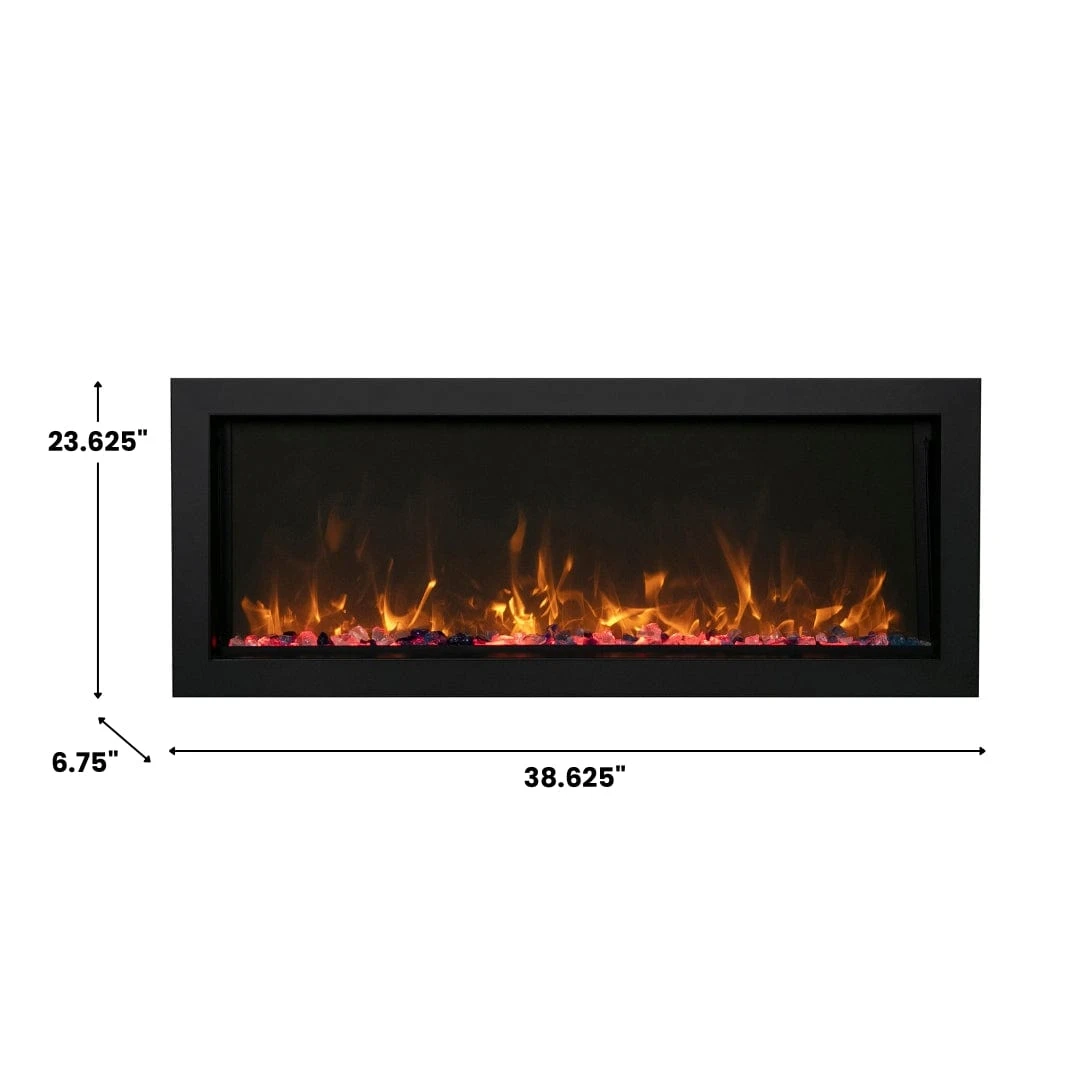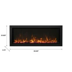 The Amantii Panorama Series 40-In Slim Built-In Electric Fireplace is a stylish unit that will bring contemporary appeal to your residential or commercial space. At just under 7 inches deep, you’ll have no trouble installing the fireplace into most drywall applications. The unit is designed to be fully recessed, and can be installed with your finishing material coming right to the edge of the glass or with the included black trim piece. A unique feature of this unit is that it can be installed both indoors and outdoors. Create a relaxing outdoor space in your covered porch/patio or add pizzazz to your family room, bedroom or media room with this stunning firebox as the focal-point. With a bright and dramatic flame effect (that can alternate between various colors) you’ll be able to create a setting that fits your specific tastes and mood. Giving you more options for how you want your fireplace to look, the unit comes with multiple media bed options. Choose from clear and blue glass diamonds or large glass nuggets. Pick one and stick with it, or change them out whenever it strikes your fancy, the choice is yours.