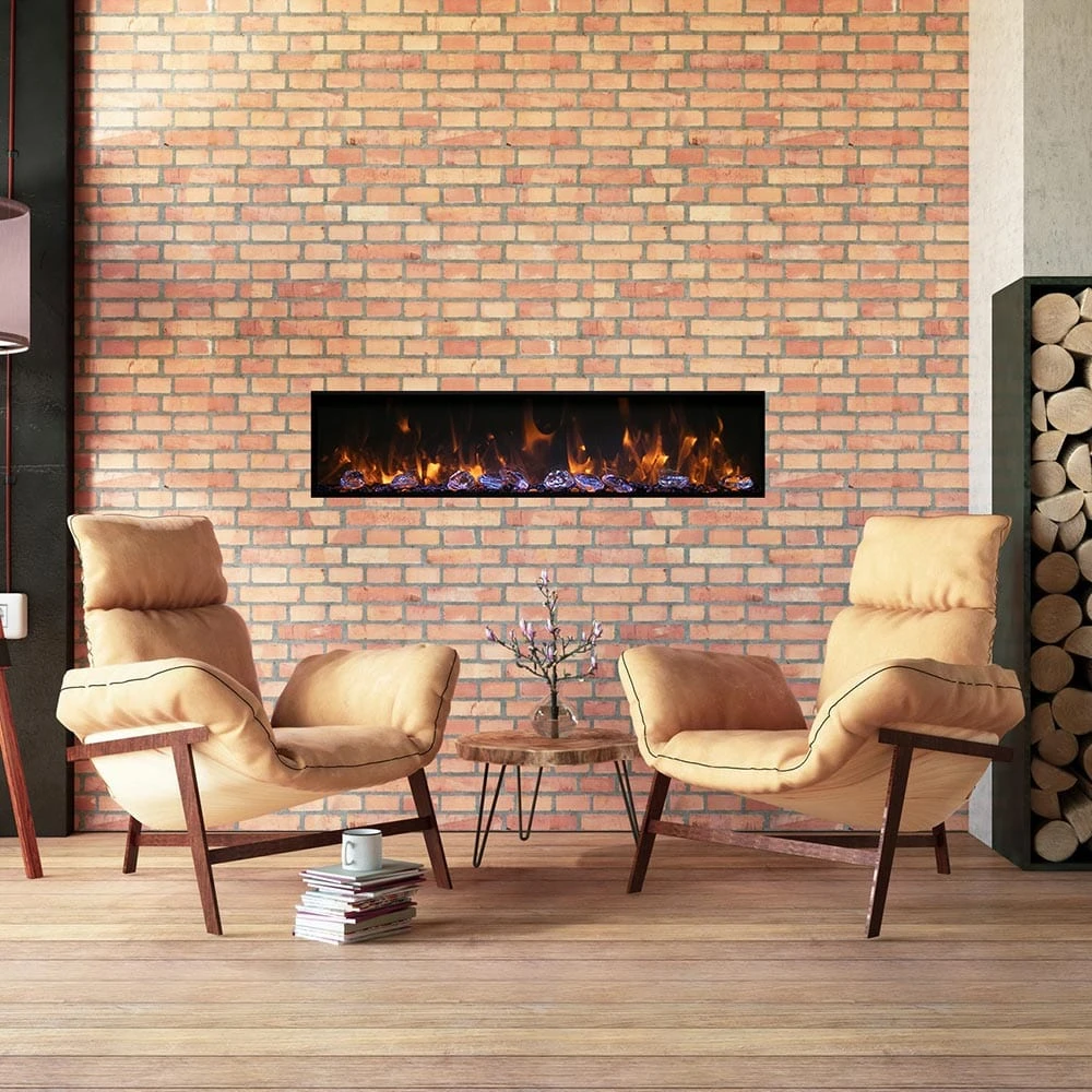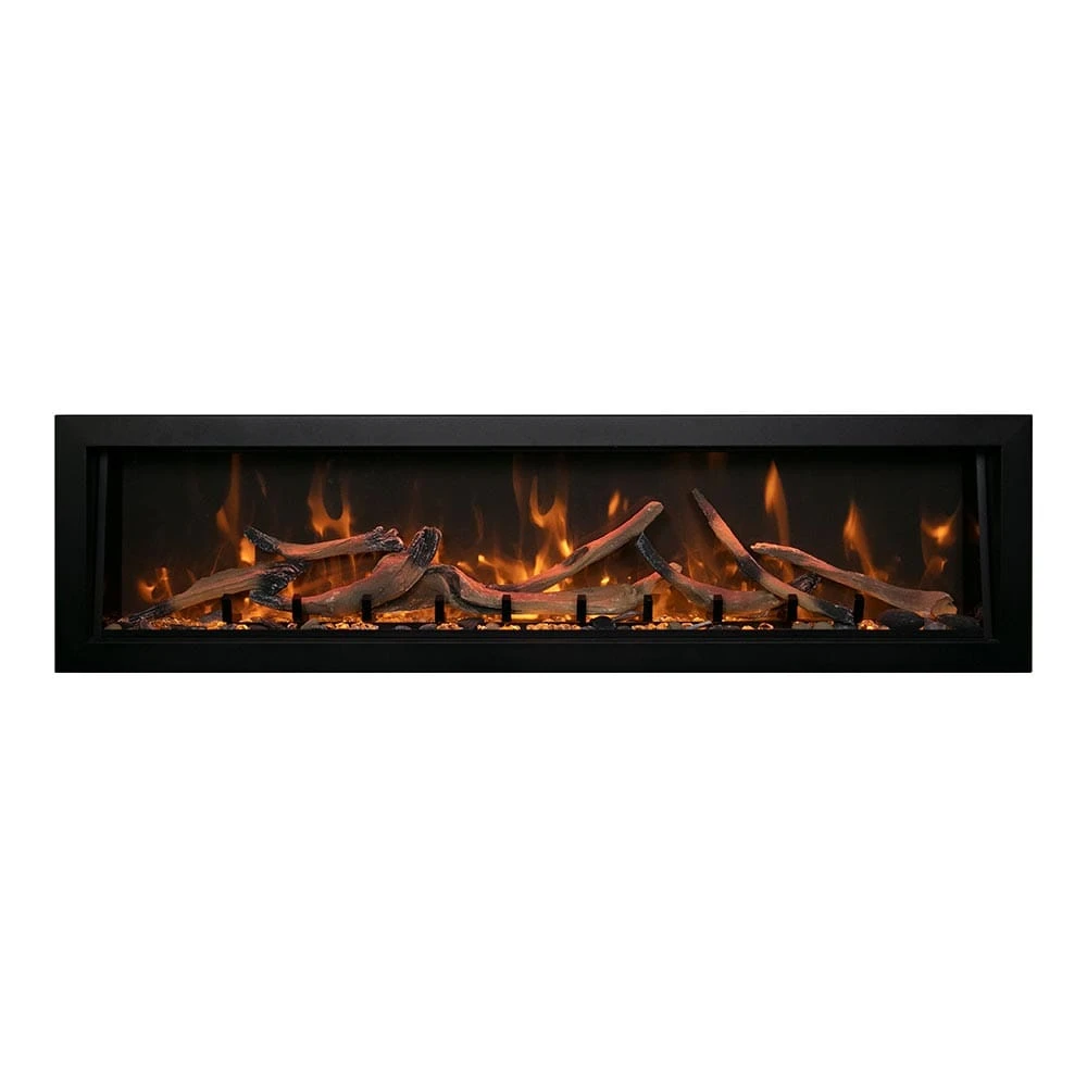 The Amantii Panorama Series 50-In Deep Built-In Electric Fireplace is a sleek, linear unit that will bring a modern appeal to your space. The fireplace is a fully recessed, built-in unit that can be used with or without the included decorative black trim, depending on your desired finished look. This allows you the option to create a virtually seamless appearance where your finishing material comes right to the glass of the unit. A unique attribute exclusive to this firebox is that it can be installed in both indoor and outdoor applications. This is a great feature for both residential and commercial spaces. The modern flame effects of this firebox create a stunning display which can be enhanced with the various flame color/brightness options as well as the 13 ambient canopy lighting colors.