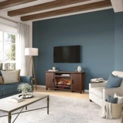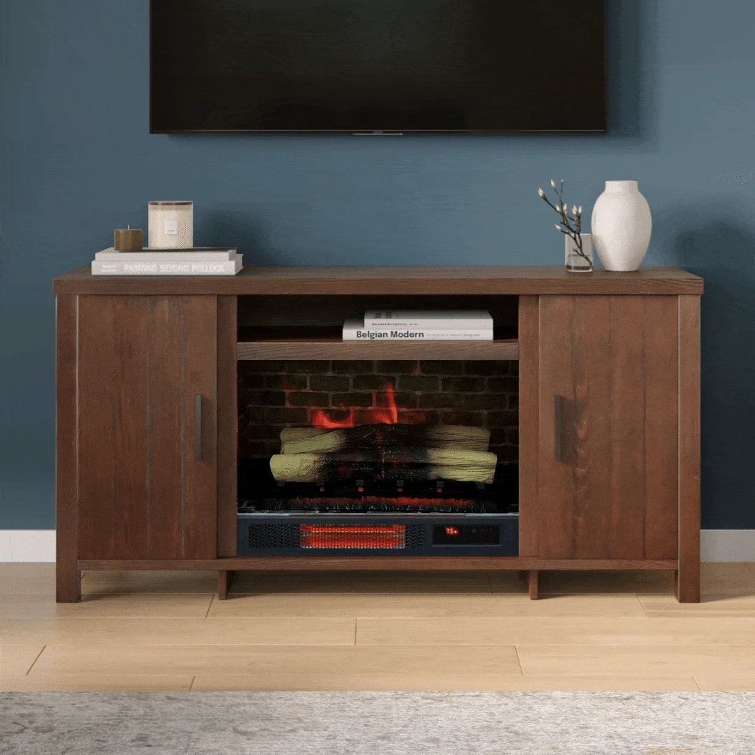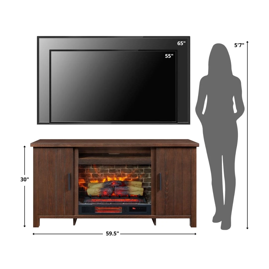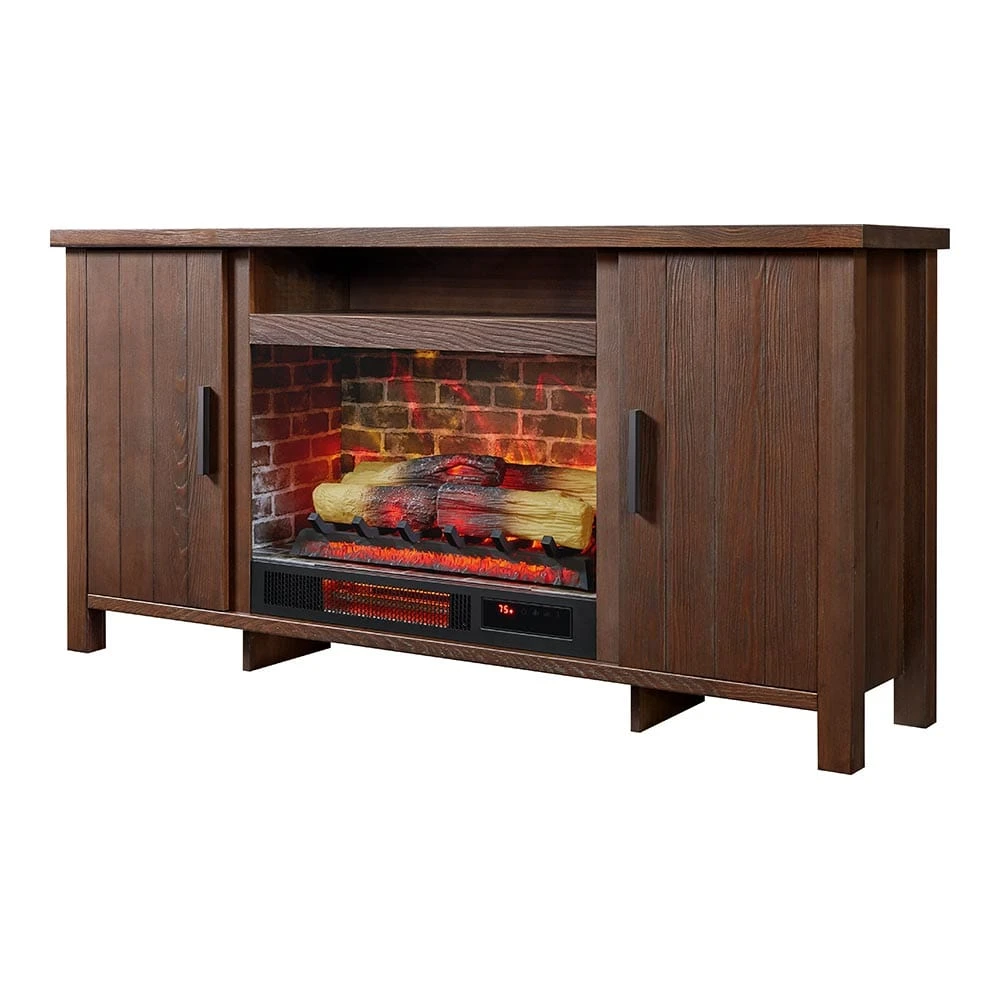 Our Country Living Brinley 60″ Rustic Brown Fireplace Media Console and TV stand boast a sturdy, furniture-grade construction that can accommodate flat-screen TVs up to 70”. The fully enclosed cabinet doors provide a great space to store your media and more with adjustable shelves for ample storage. This tv stand package includes a 26″ electric fireplace with infrared supplemental heat capable of warming areas up to 1,000 sq. ft. This electric fireplace heats up your space while the TV stand surface remains cool to the touch. The multi-function remote allows you to set your preferred temperature and timer, offering up to 9 hours of continuous heat to set your desired comfort level. Enjoy the vibrant and energy-efficient LED lighting with 3 flame effect options and 5 flame speed settings to suit your ambiance. Assembly is required, and the unit operates using a standard 120V outlet, making it a practical and stylish addition to your home.