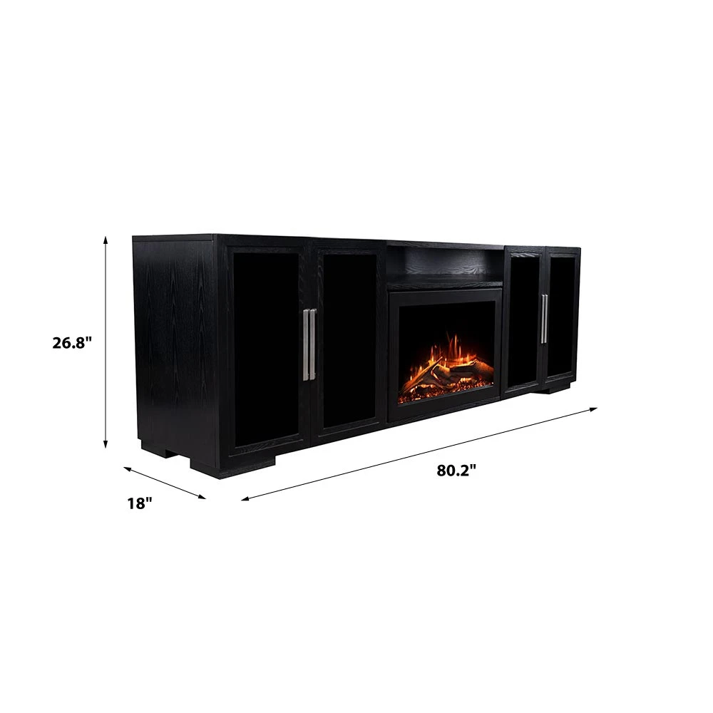 Upgrade your living space with the Modern Ember Channing 80-in Smart Black Electric Fireplace TV Stand, a perfect fusion of striking contemporary design and practical functionality. Crafted with a sleek black finish, this TV console embodies modern sophistication. Its clean lines and minimalist aesthetic make it a versatile addition to any room, adding a dramatic and moody vibe to the room. Smoked glass front side cabinets with glass shelves provide a stylish storage solution with wire management to keep your consoles organized.