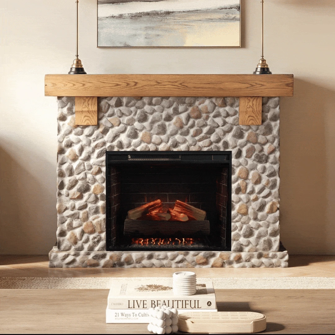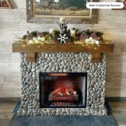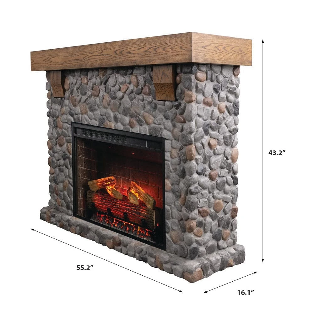 Create a stunning visual centerpiece in your home with the Country Living Glenbrook Electric Fireplace Mantel Package. Designed with rustic elegance, this unit features a cast stone mantel with a river rock-inspired design topped with a durable white oak mantel shelf. The combination of natural textures and warm tones brings inviting charm to any space while complementing a variety of décor styles.
