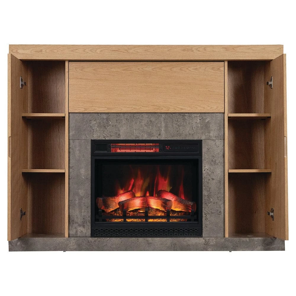 Designed for both function and style, the sturdy construction features a five-leg support system, ensuring durability. Adjustable shelves behind two side cabinet doors provide ample storage for media accessories, books, or décor. Conveniently control the fireplace settings with the digital thermostat, built-in timer (up to 9 hours), or included multi-function remote, allowing you to customize your comfort with ease.