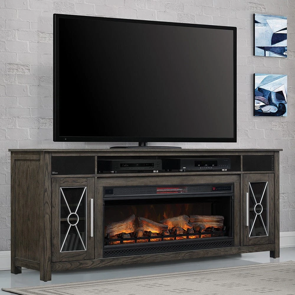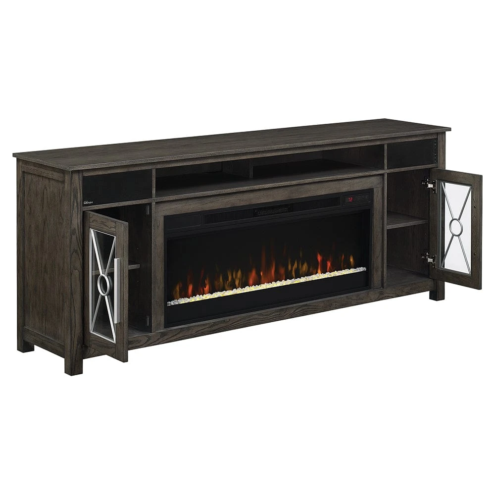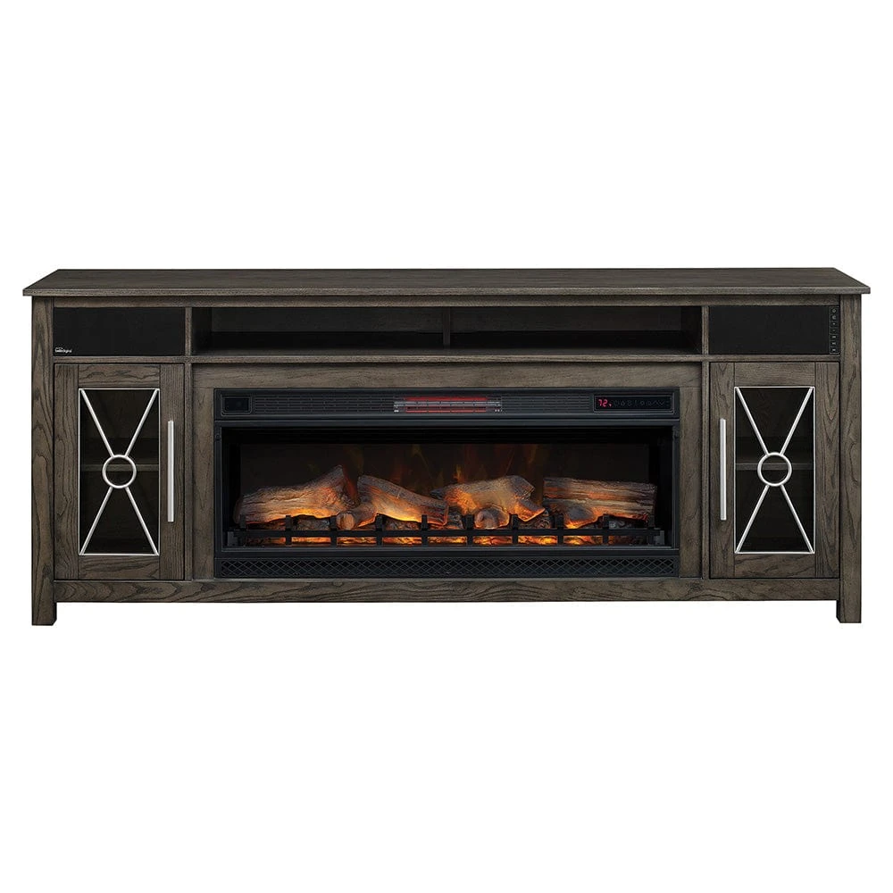 With a perfectly balanced aesthetic of both contemporary and traditional appeal, the Heathrow Electric Fireplace Entertainment Center will make a wonderful addition to your home. Its grand size makes the Heathrow the perfect choice for those looking to create the ideal home theater setup. Capable of accommodating a flat screen TV up to 80″ in size and offering a fully integrated Bell’O sound system, the cabinet offers everything you’ll need to become the envy of all your guests. The Bluetooth enabled stereo system makes listening to your favorite music a breeze, while the cable integrations make it easy to connect with your TV and DVD player. With two open center shelves and two side cabinets, you’ll have more than enough space for housing your electronics and accessories. The Heathrow media console truly is the perfect piece of decorative and functional furniture for your home.