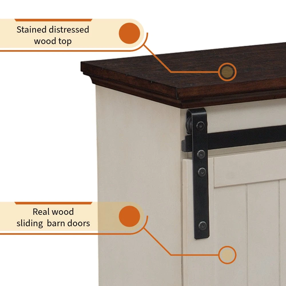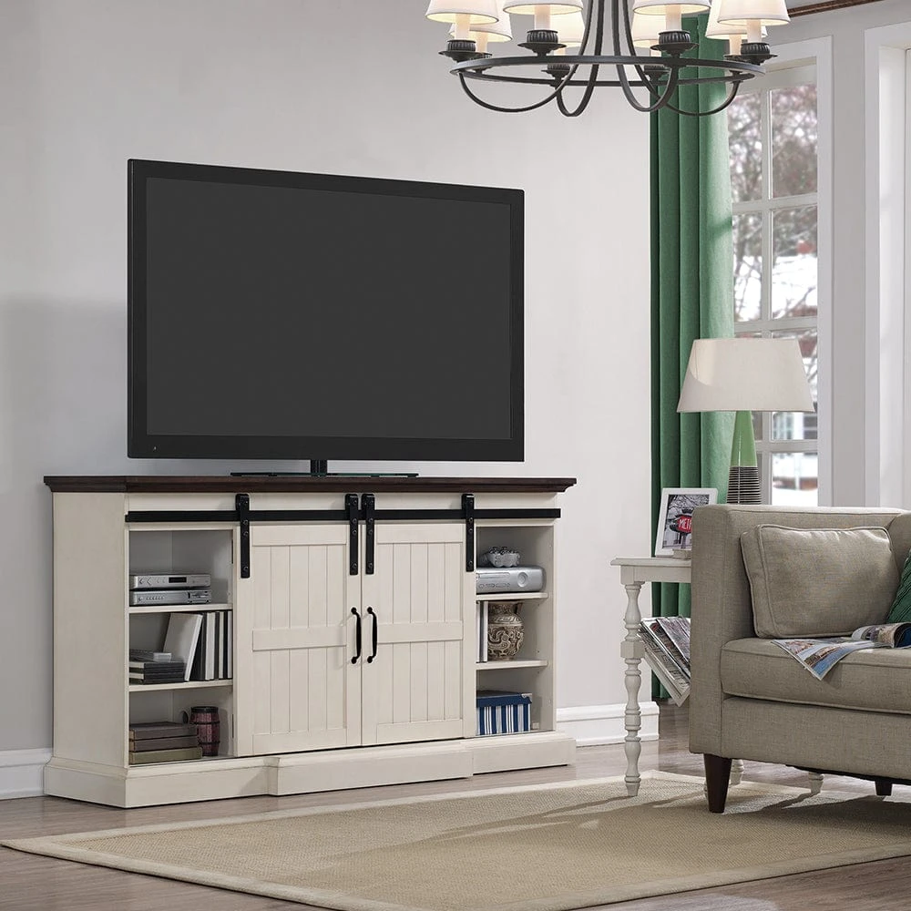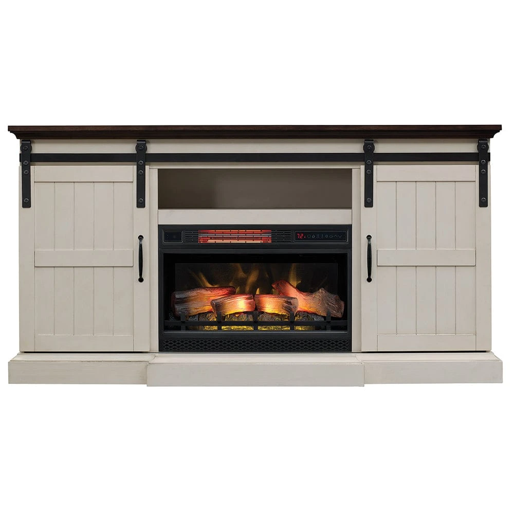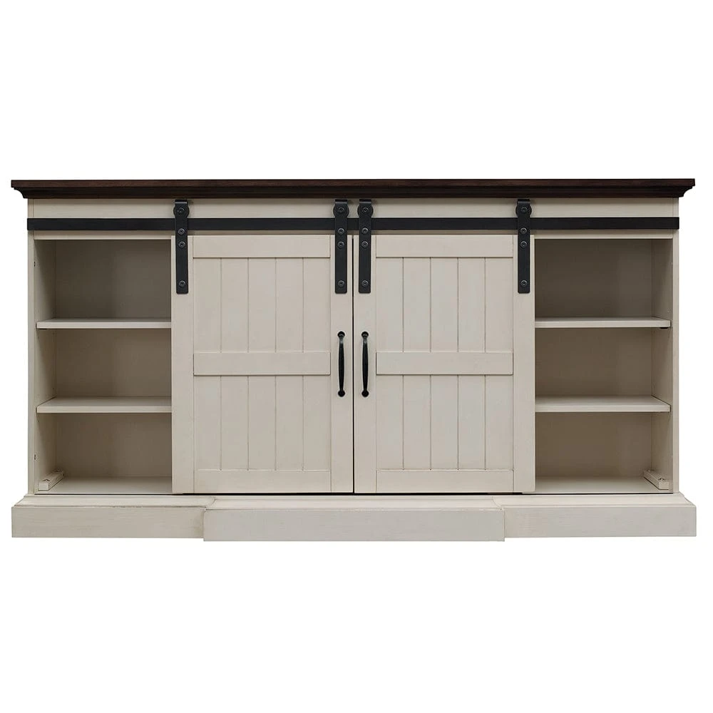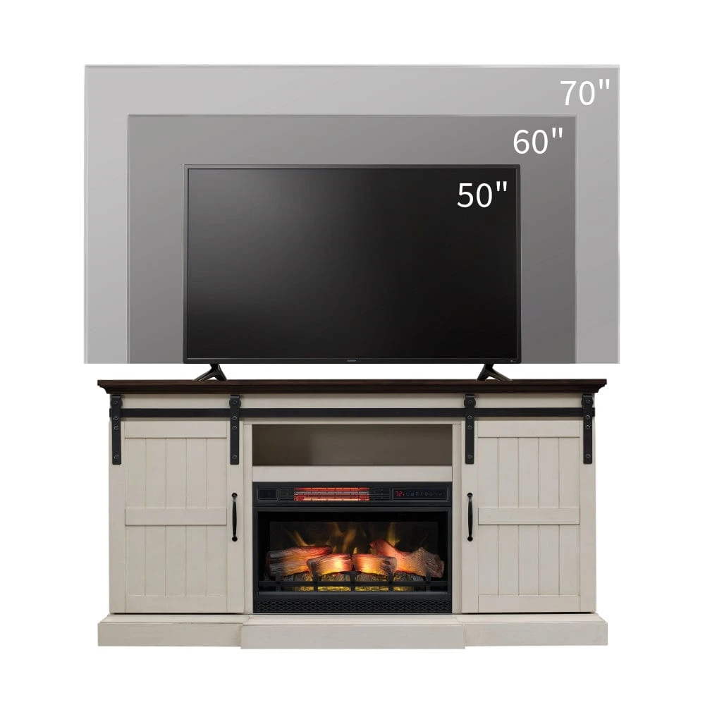 Give your room an added touch of coziness with the addition of the beautiful Hogan Farmhouse Electric Fireplace TV Stand. The modern farmhouse design of this cabinet makes it a popular style with current trends. Featuring a kickout hearth, functional sliding barn doors w/ planking details as well as pewter hardware, the Hogan hits all the details of a designer’s dream. The Weathered White finish and contrasting brown top create a stunning visual that complements multiple color pallets and design schemes. The center shelf is open and can easily accommodate your cable box or DVD player, while the two side cabinets offer additional concealed storage with 2 adjustable shelves as well as cord management/ventilation holes.