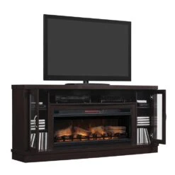 The Hutchinson Infrared Electric Fireplace Entertainment Center in Oak Espresso is an appealing design that is simple in style, yet will make an impactful presence in your home. This extra wide media console can accommodate flat screen TV’s up to 80″ and 155 lbs, so you’ll have no problem creating a jealousy inducing home theater setup. The open center shelf is perfectly sized for your DVD player and cable box, or even soundbar, depending on your needs. Two glass-fronted cabinets anchor both sides of the firebox with ample storage for electronics and accessories. Give your room contemporary appeal with the addition of this beautiful entertainment cabinet.