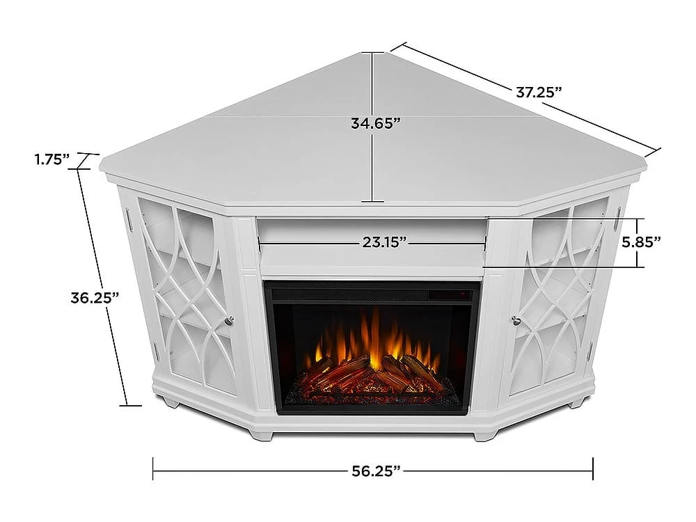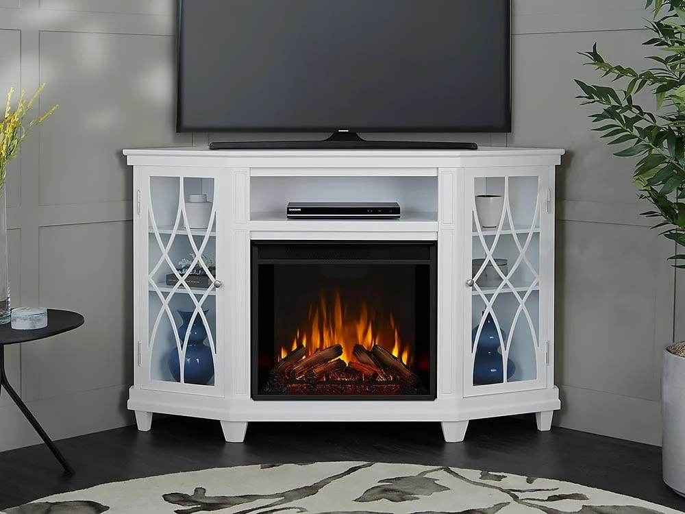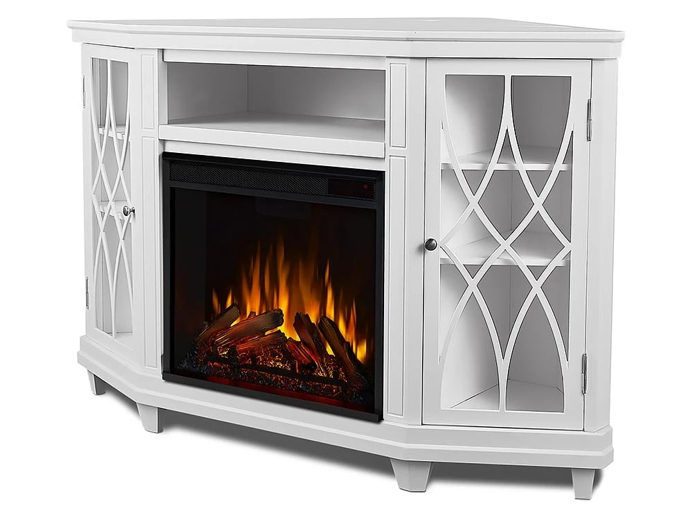 Add dramatic interest to the unused corner of your room with the addition of the Lynette Corner Electric Fireplace TV Stand. Not only are corner spaces difficult to decorate, they often are an untapped resource when it comes to rooms tight on space. The Lynette addresses this with quality, high class fashion. The console features a classic design with glass doors and decorative curved mullion bars. A center shelf and 4 side cabinet shelves offer space for your DVD player, cable box and media accessories. Taking center stage is the impressive VividFlame LED-lit firebox. You’ll love the soothing ambiance this life-like fireplace creates within your room. The resin cast logs glow for authenticity while the flickering flames rhythmically rise from behind, creating a spectacular illusion. The flame brightness can also be adjusted to create the perfect level of ambient lighting