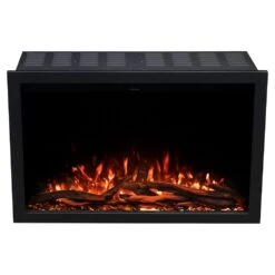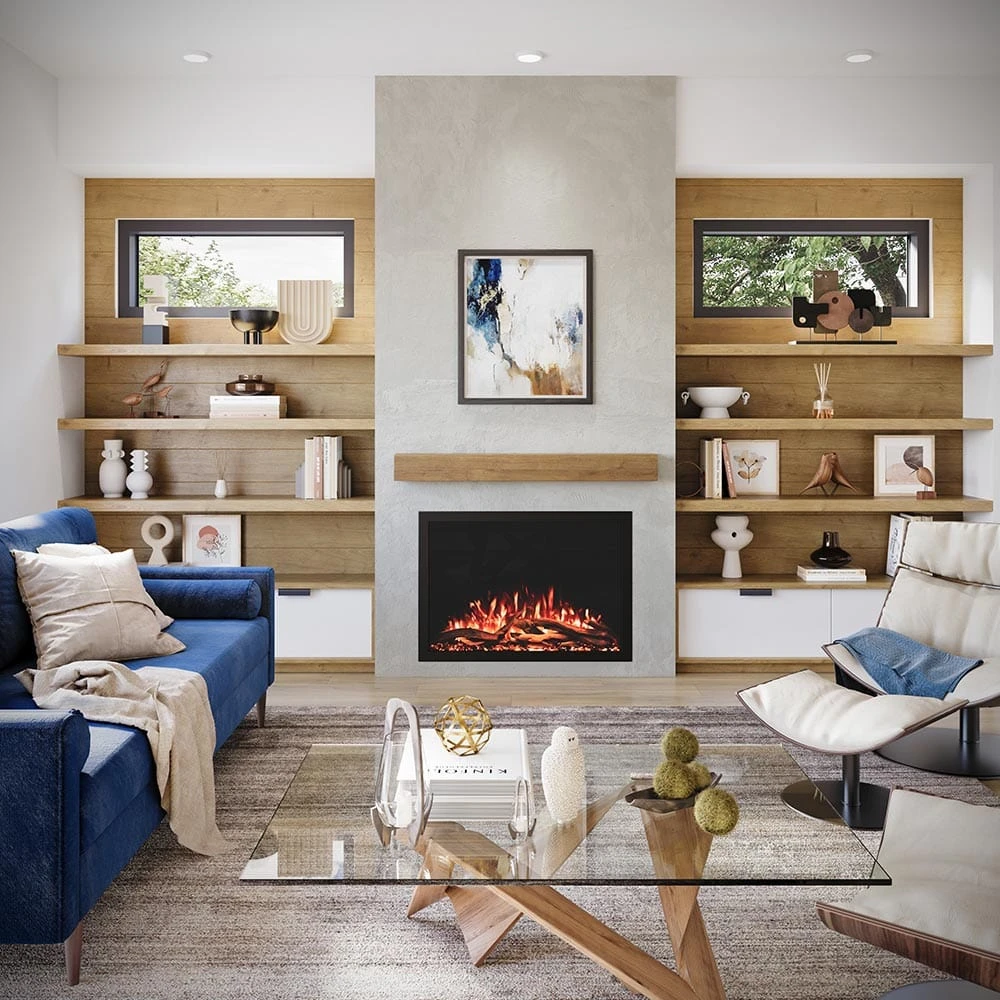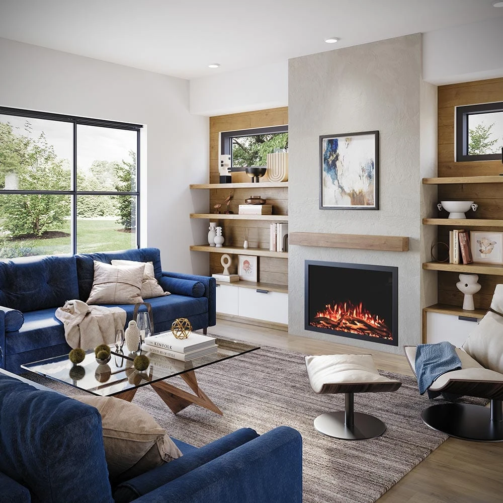 Bring warmth and sophistication to your space with the Modern Ember Highmark Traditional Built-In Electric Fireplace. Designed for a seamless, built-in look, this self-trimming unit offers both classic charm and modern innovation. The concrete-look firebox backdrop adds a contemporary touch, while the driftwood log set and shimmering glacier crystals create a stunningly realistic flame display.
