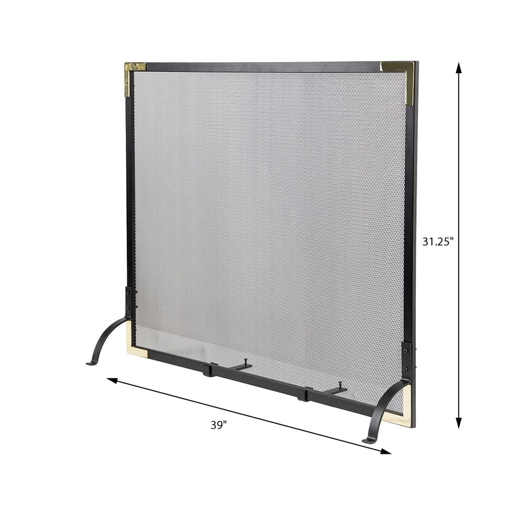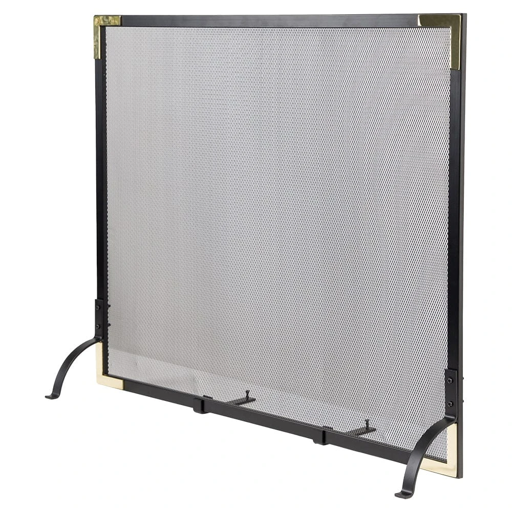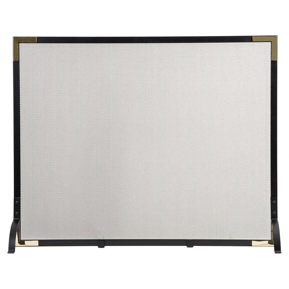Our Modern Ember Cecilia Single Panel Fireplace Screen is crafted from heavy-duty steel fortified with a durable black powder coated finish. The strong mesh screen acts as a barrier to help keep ember sparks inside the fireplace and away from the living area. The contemporary design of this single panel safety screen is highlighted by the stylish brass corners. This fireplace screen is secured with corner legs and two center legs that allow for easy tilt control. Curious hands and paws will be prevented from nearing the flames and hot ashes with the Cecilia Single Panel Fireplace Screen.
