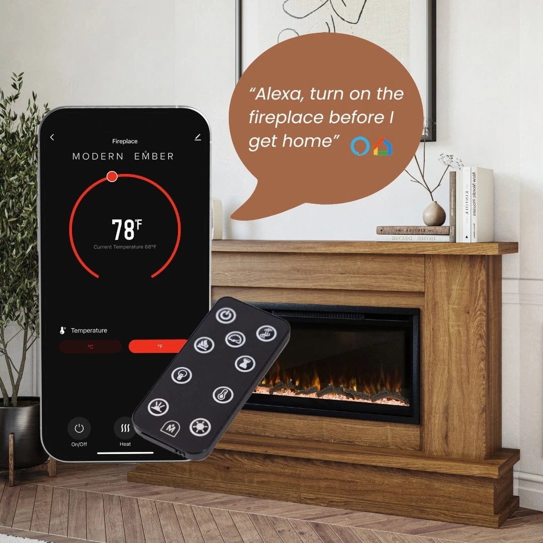 Enhance your home with the Modern Ember Smart Patton Electric Fireplace Mantel Package, a perfect blend of contemporary design and advanced technology. Crafted with a high-quality poplar wood mantel surround, this sleek and sophisticated fireplace adds a modern focal point to any living space while providing customizable warmth and ambiance.