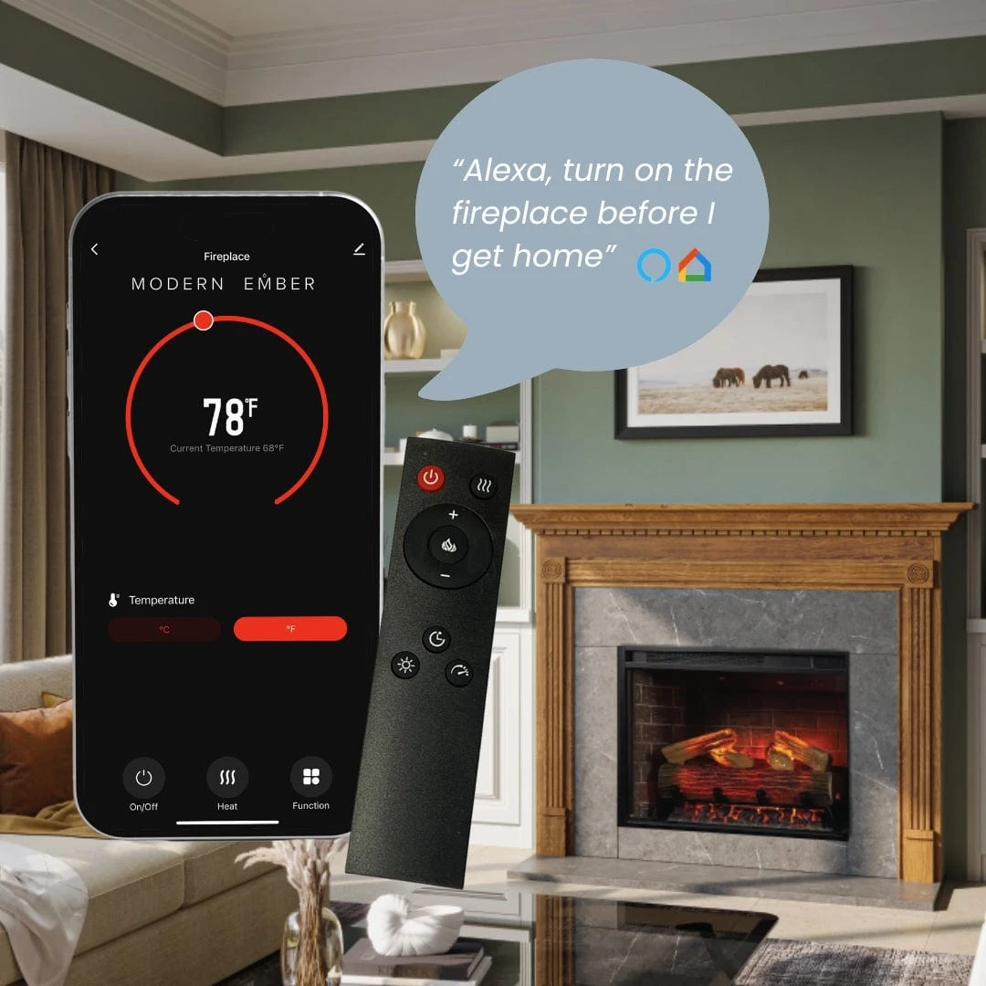 Powered by energy-efficient LED technology, this realistic electric fireplace features a detailed resin log set and glowing ember bed, creating the perfect ambiance at the touch of a summary. Customize your experience with adjustable flame colors, speed, and brightness, all controlled via smart device, voice command, or remote.