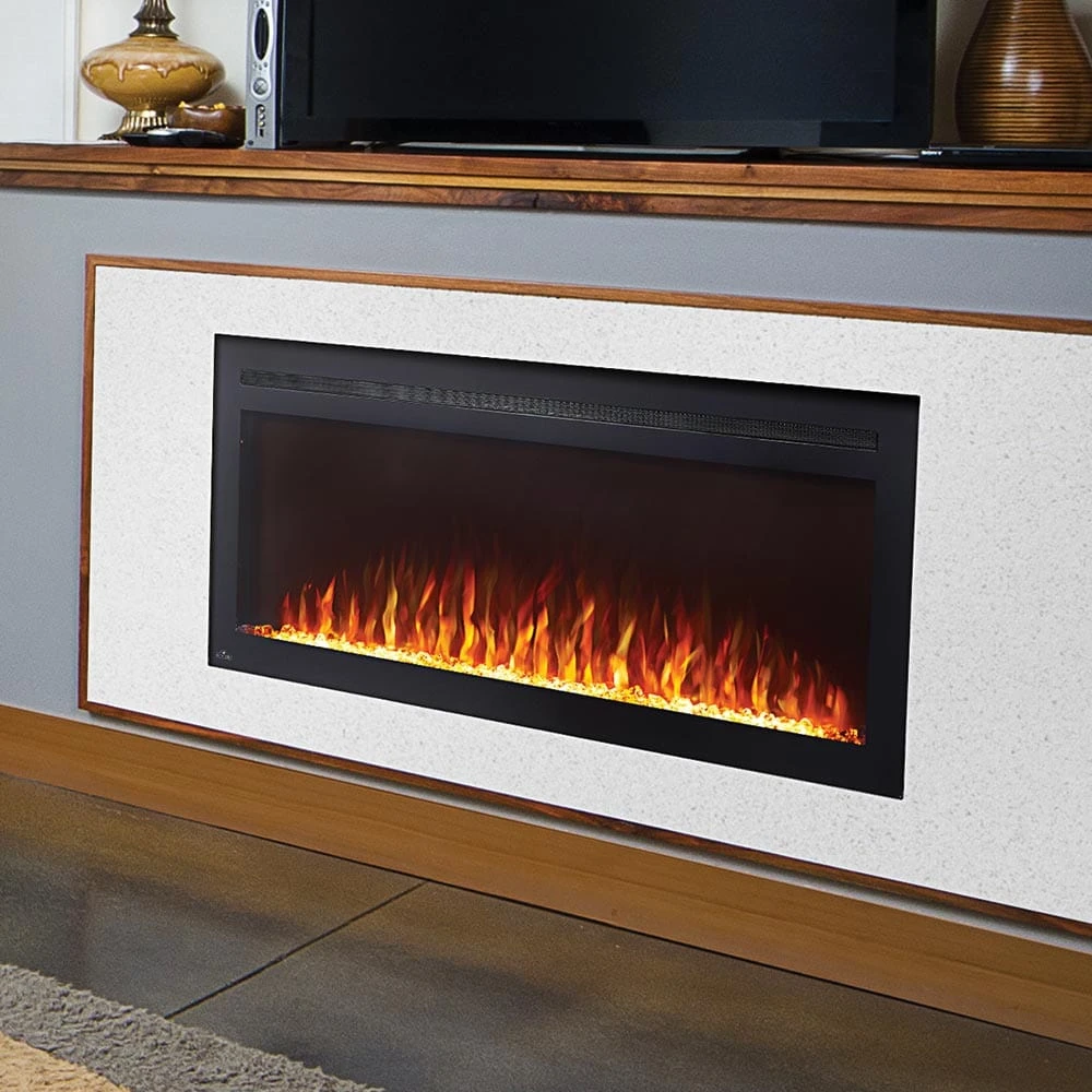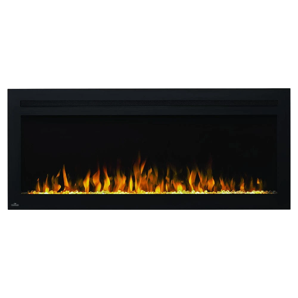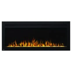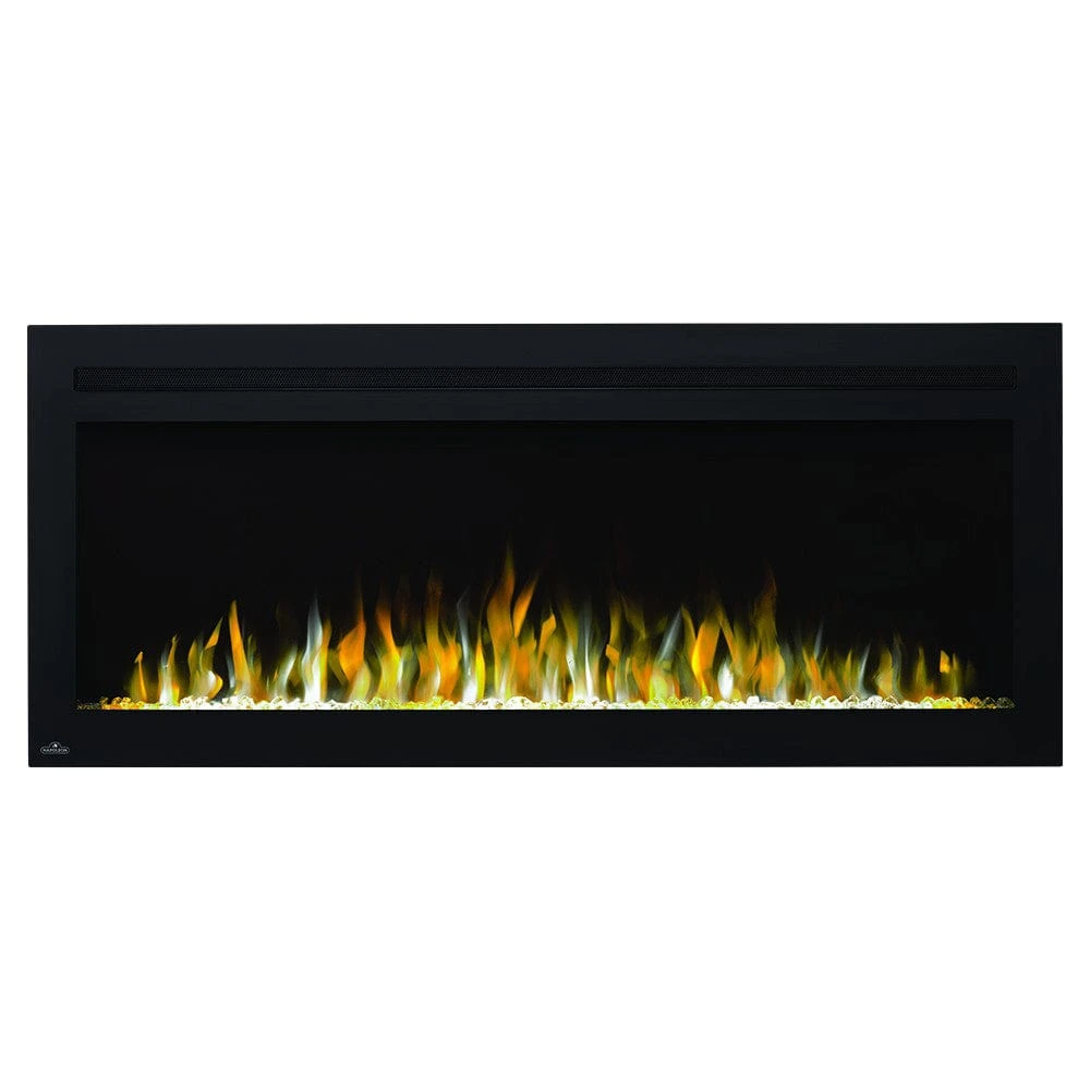 The Napoleon 50-In PurView Wall Mount Electric Fireplace offers contemporary styling at an affordable price. This modern, linear fireplace is capable of being hung directly on your wall or partially/fully recessed, its completely up to you and the finished look you desire. The impressive fireplace utilizes bright and energy efficient LED lighting to produce the dancing flames that also reflect off the crystal ember bed. Choose from orange or white flame effects that are easily changed using the included remote control or on the manual summarys located on the unit itself.