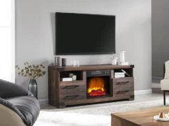 Boasting a stylish Industrial inspired design, the Perry Electric Fireplace TV Stand is a wonderful masculine addition to your space. With a plank styled rustic brown finish and decorative black hardware accents, the Perry can be used in both contemporary or rustic room schemes. Two open shelves are located on either side of the firebox and are great places to store electronics or display small decorative accents. Below the shelves are two cabinets disguised as drawers. Behind these doors you’ll find plenty of storage for additional media components or for your movie or book collections. At its center, the Perry showcases an 18″ firebox that produces vibrant flames using advanced and energy efficient LED lighting. A resin cast log set and molded ember bed adds to the overall illusion with an inner glow, just like a real fire.