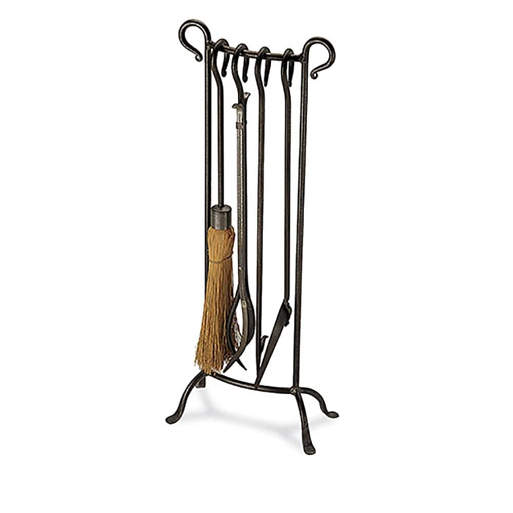 A timeless design hand forged with care and precision. Crafted from solid iron bar stock, this tool set will satisfy for generations. Includes brush, tongs, poker and shovel.
