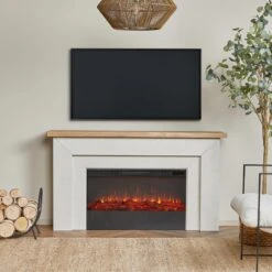 Illuminate your home or office with the contemporary appeal of the Real Flame Malie Landscape 67-in Electric Fireplace Mantel Package that mimics the look of Venetian plaster with a sleek matte finish. Part of the Real Flame VividFlame Landscape Series, the widescreen electric fireplace replicates the appearance of a genuine flickering fire without the need for a chimney or vents and conveniently plugs into a standard outlet. This indoor fireplace package features a mantel with a genuine wood finish, offering six flame colors, five flame brightness levels, an adjustable thermostat, timer function, and automatic safety shut-off. The electric fireplace delivers supplementary warmth for rooms up to 1,000 sq ft, and the infrared heater can be turn off for year-round enjoyment of the comforting ambiance of a glowing LED flames.