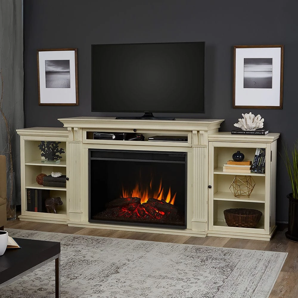 The Tracey Infrared Electric Fireplace Entertainment Center is a stunning piece of furniture you will be proud to show off to your friends and family. Go on, its ok. Brag about it. The Tracey Media console has a lot to show for itself. With fluted columns, decorative trim molding, corbel details as well as a refreshing distressed white finish, the Tracey hits the mark on several design trends. Additionally, the cabinet can easily accommodate flat screen TVs up to 75″ and 100 lbs. The center, drop down cabinet is ideally sized for your cable box and DVD player, while the two side cabinets offer additional storage for media or decorative accessories. At the center of the unit is the large, VividFlame firebox that creates the life-like illusion of a real wood burning fire. The LED lit flame projections appear to rise from molded, burnt logs and a glowing ember bed for a truly authentic look.